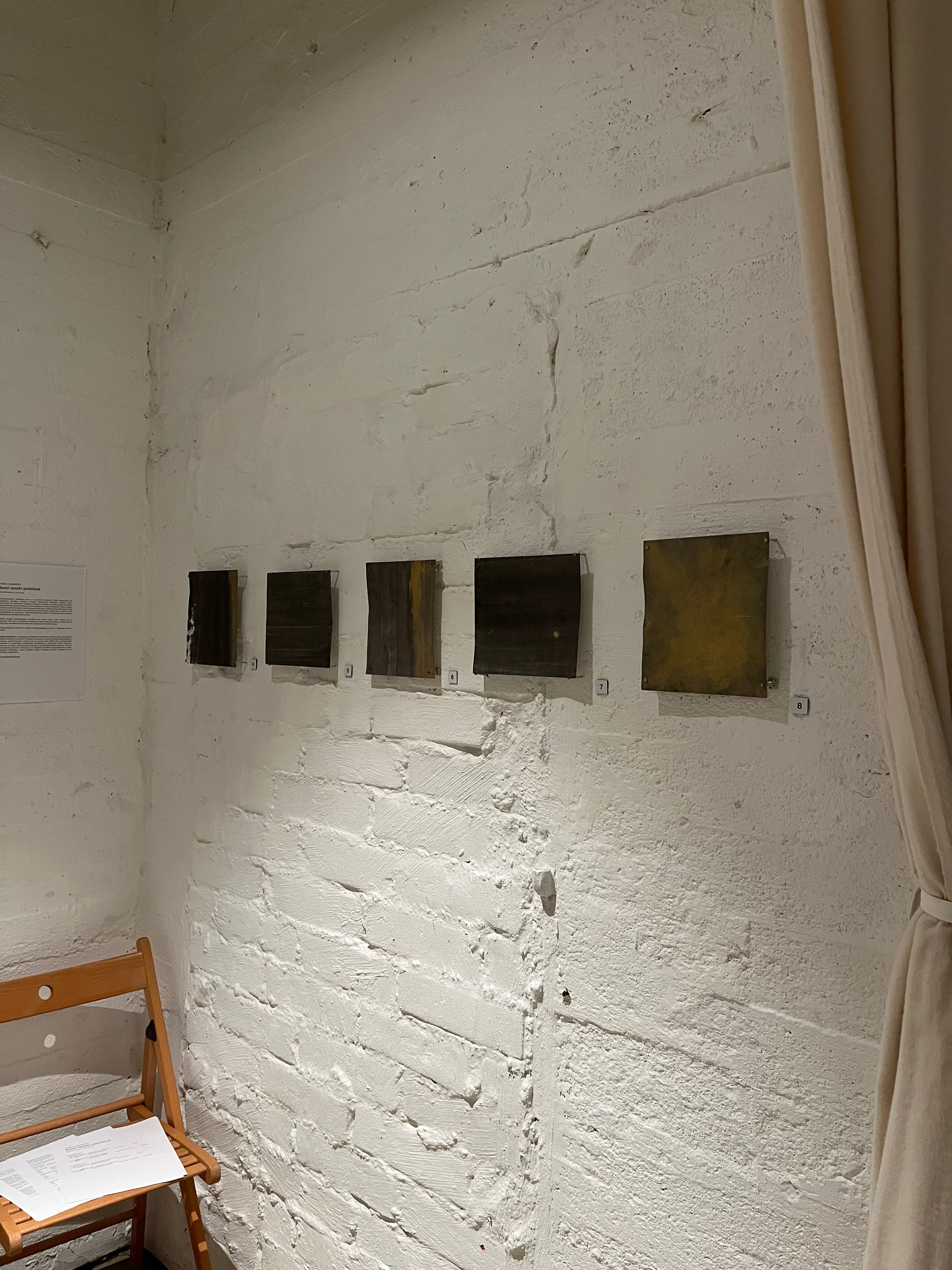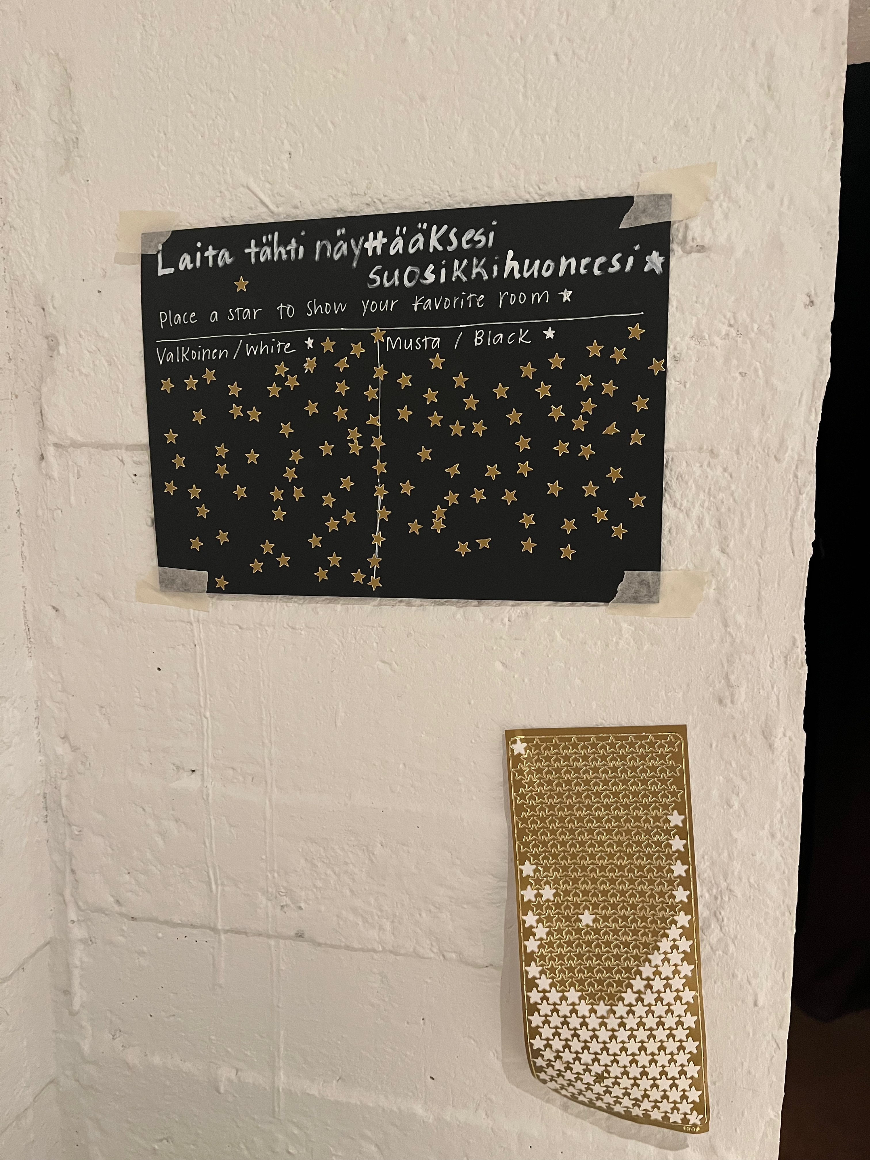 In Galleria Ronga’s Medikulma, two of the same works are displayed in different rooms. One piece is in the white room and the other in the black room. Dark room used only two small lamps from the floor which were created as candle lights. I left a voting board where visitors can vote on which room was more comfortable. The results were almost even, and many visitors who voted to the black room left reviews – “It was surprising seeing that the artwork can be so beautiful even in the darkroom. “, “ My heartbeats became so calm when I was in the darkroom.”